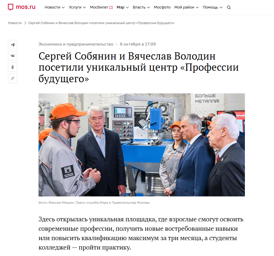 Сергей Собянин и Вячеслав Володин посетили уникальный центр «Профессии будущего»