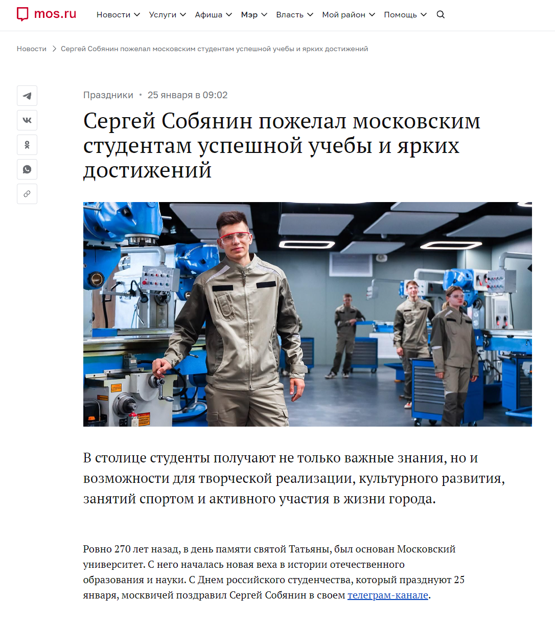 Ровно 270 лет назад, в день памяти святой Татьяны, был основан Московский университет. С него началась новая веха в истории отечественного образования и науки. С Днем российского студенчества, который празднуют 25 января, москвичей поздравил Сергей Собянин в своем телеграм-канале