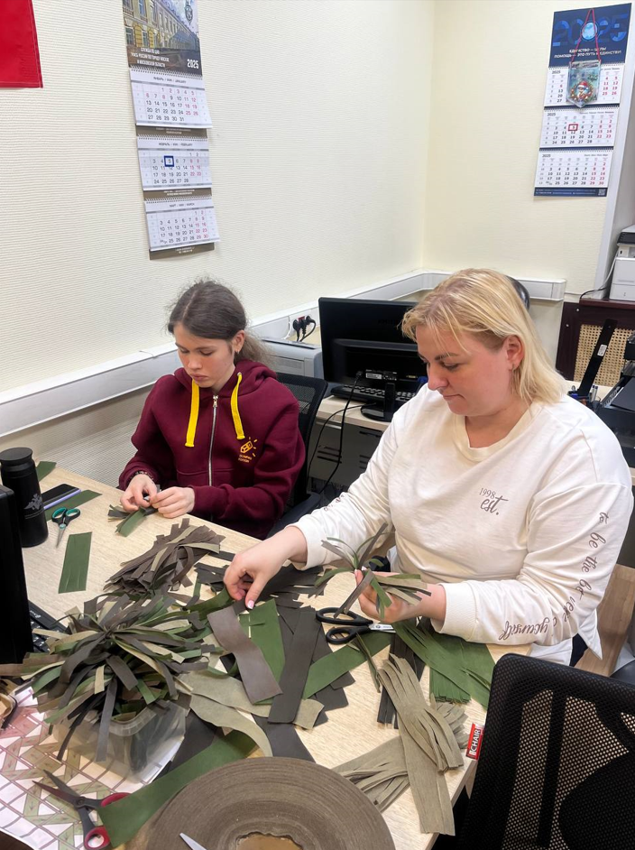 5 февраля 2025 года волонтеры Юридического колледжа совместно с советником директора по воспитанию Е.С. Абрамовой приняли участие в мастер-классе по плетению маскировочных сетей